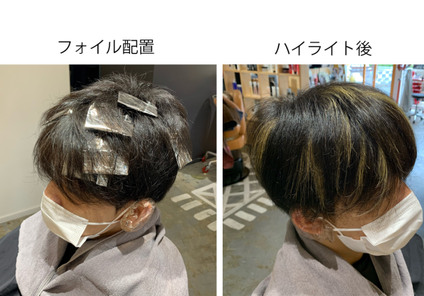 ハイライトは、カットで出した束感と同じ幅のチップで動きを更に強調させるイメージです。フォイルは少ない枚数(8~10枚程度)で配置します。