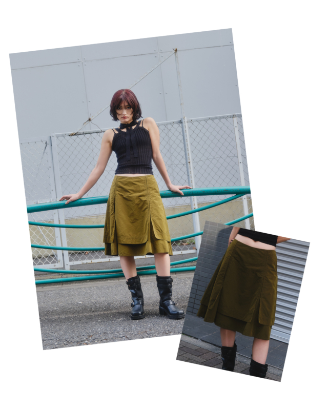 カーキの二重になったスカート裾のデザインが、フェミニンなムードを引き立てる。