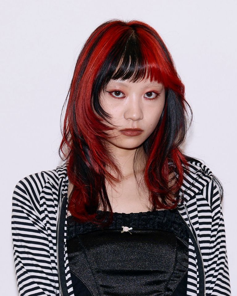 「強さのある赤を、面ではなく線で取り入れることで、奥行きのある印象に仕上げました。顔まわりにデザインを集中させることで、トレンド感がありつつ、視線を集められるデザインにしています。アシンメトリーのデザインは放射状に作ることで、サロンワークでもオーダーの多いレイヤーカットにも相性が良くなります。アップスタイルでもダウンスタイルでも見え方が変わるので、おすすめです。」