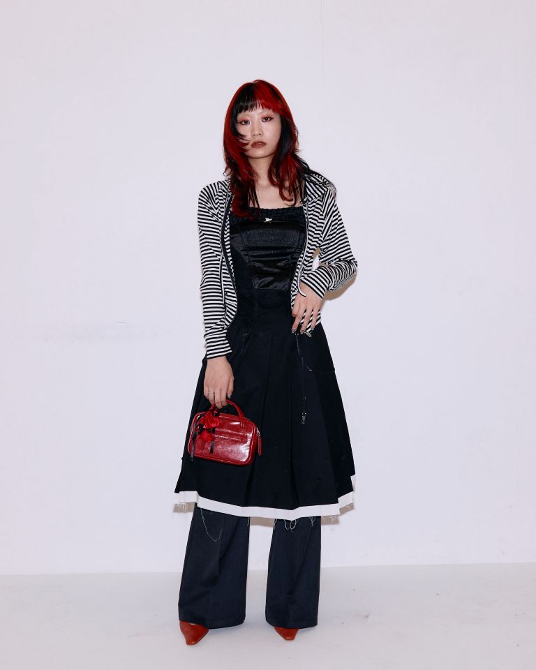 「ヘアに合わせ、黒をベースに差し色としてバッグで赤を取り入れたスタイリングです。全体的にクールな印象でありながらも、モデルさんの雰囲気に合わせてパンツとスカートのレイヤードでフェミニンさを追加しています。」