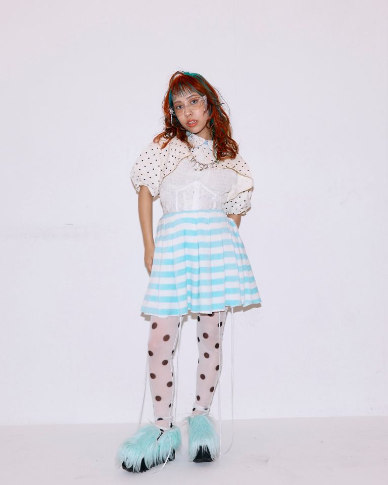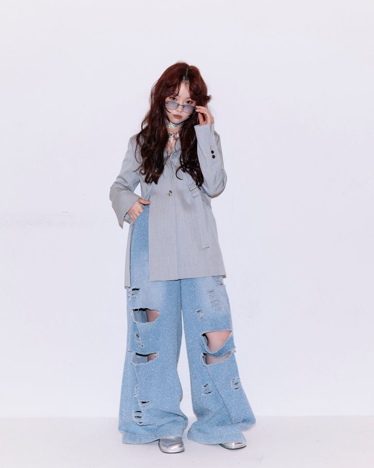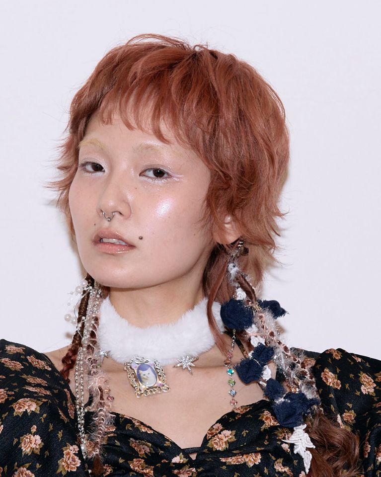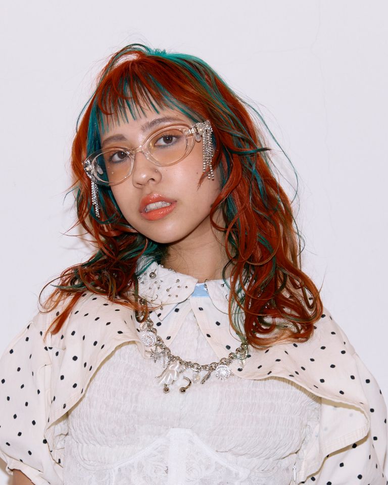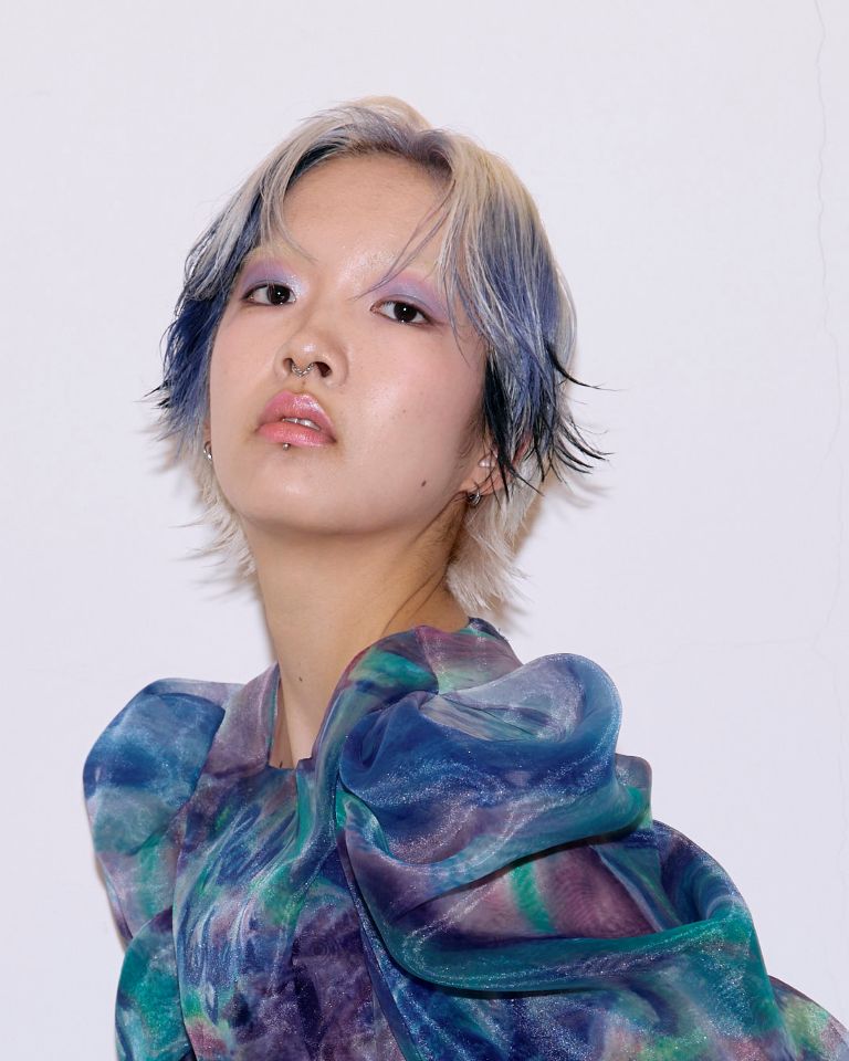 「ヘアに合わせて、水色をポイントに取り入れたスタイリングです。モデルさんの普段のファッションと、引き続き流行中のY2Kのポップさをベースにしながら、ヘアが引き立つバランスを意識しました。」