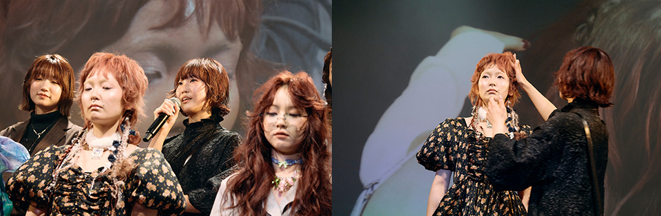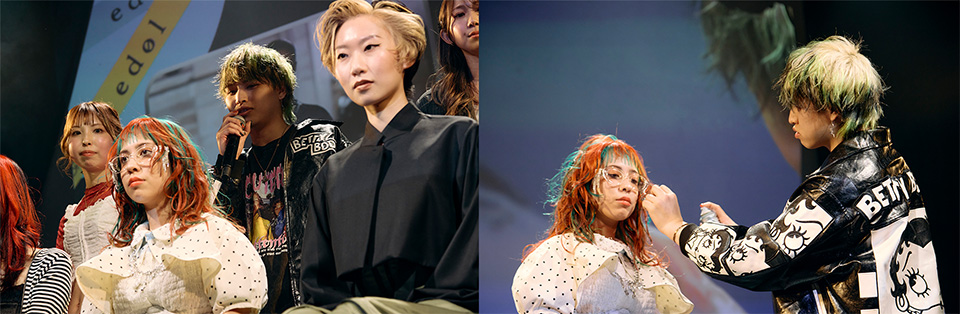 「今季のトレンドカラーであるくすみピンクをメインに、ガーリーなヘアに仕上げました。ハイレイヤーのモデルさんのヘアスタイルに合わせて、同じ色みの中で3色のグラデーションを作っていて、動いた時に陰影が出るようにカラーを入れているのがポイントです。実は今回のヘアショーに合わせて、エクステも手作りしています!」