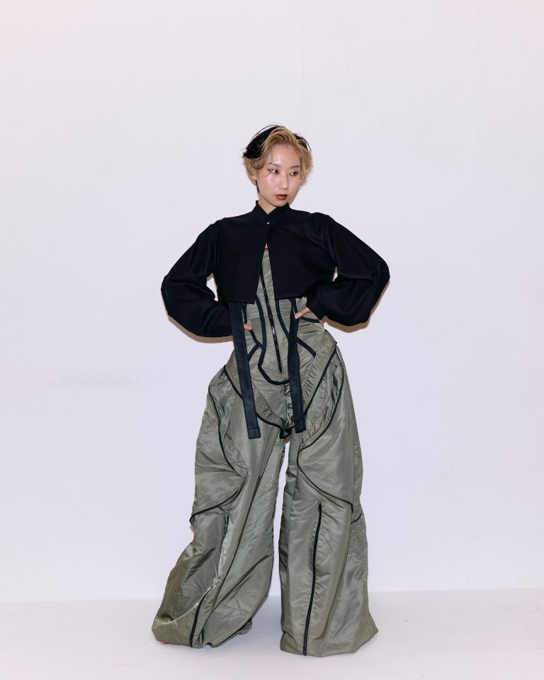 「80年代のバルーンパンツをテーマにしたスタイリング。華やかなバルーンパンツには、ショート丈のジャケットを合わせてバランスを取っています。ブラックとグリーンでまとめながら、ヘアとモデルさんのクールビューティーな雰囲気を引き立てるようなスタイリングにしています。」