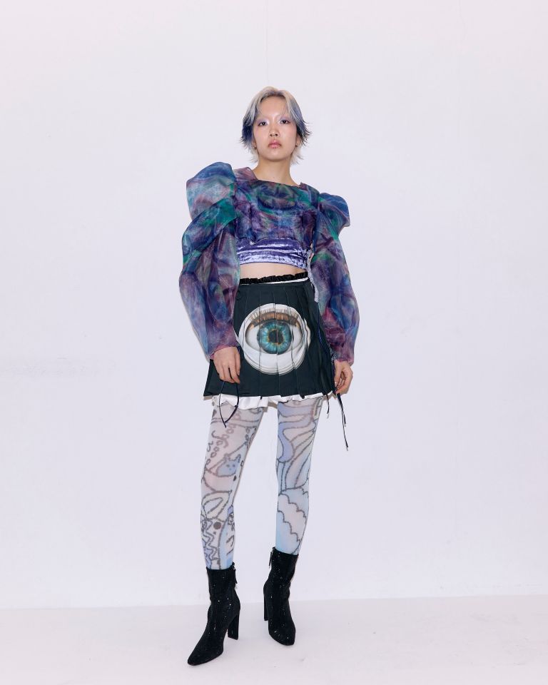 「80'sのリバイバル、ビッグショルダーをポイントにしたスタイリング。ビッグショルダーといえばジャケットスタイルが主流ですが、今回は遊び心を加えて、肩にボリュームがあるトップスをメインにしながら、目が大きく描かれたスカートを組み合わせ、個性的なスタイリングにまとめています。」