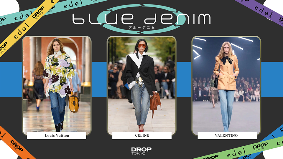 カジュアルな印象のブルーデニムに構築的なジャケットなど、相反する雰囲気のトップスを組み合わせるのが今年のトレンド。